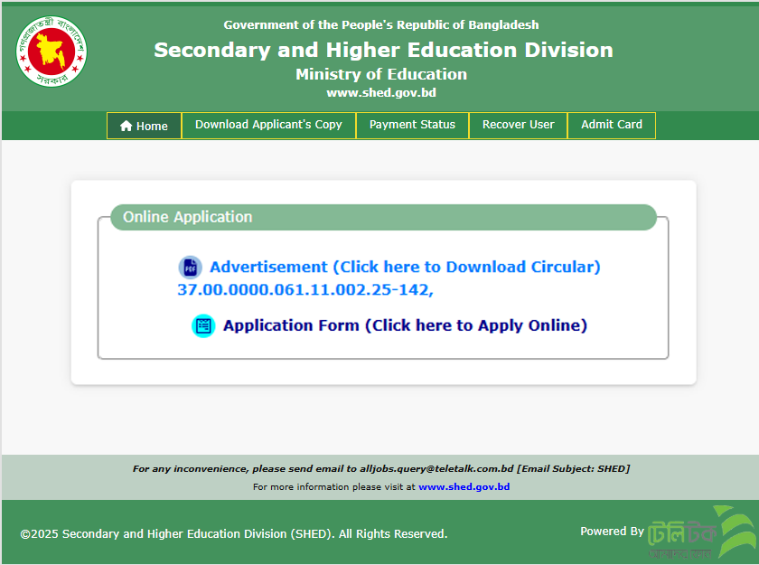 : https://shed.teletalk.com.bd/ (11 Dec 2025 )